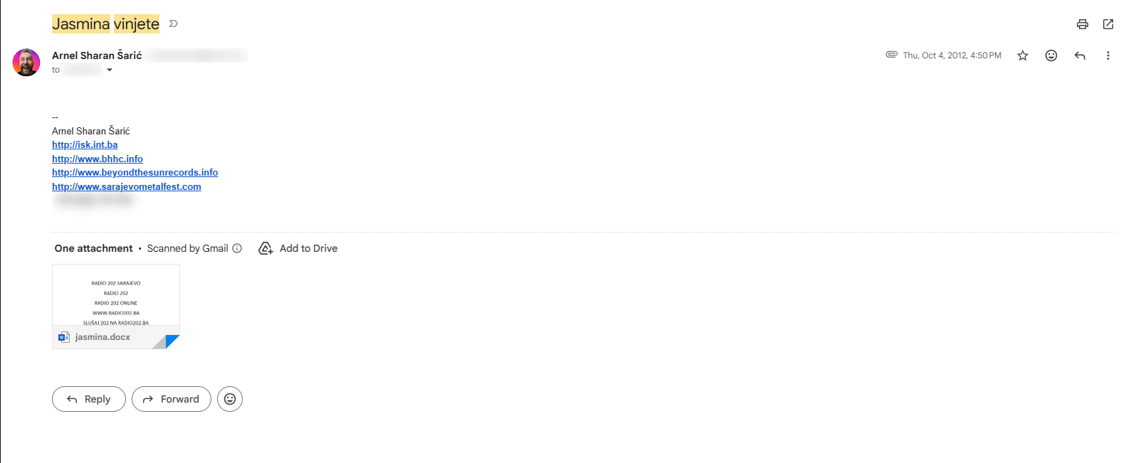 S obzirom da sam hrčak, vjerujem da neke od tih vinjeta leže negdje na diskovima, ali u pošti sam našao samo ovaj mail iz 2012. godine u kojem sam pisao šta sve Jasmina treba snimiti. I ovom prilikom joj mnogo i od srca hvala što nam je onomad kao dječurliji izašla u susret.