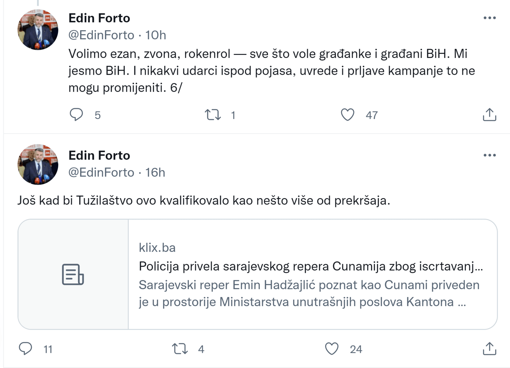Primjer takvih devijacija je premijer Kurtona Sarajevo, Edin Forto. Ovo su dva Fortina cvrkuta koja, iako tematski odvojena, savršeno pokazuju o kakvom se pokušaju proklizavanja u anuse javnog mnijenja radi.